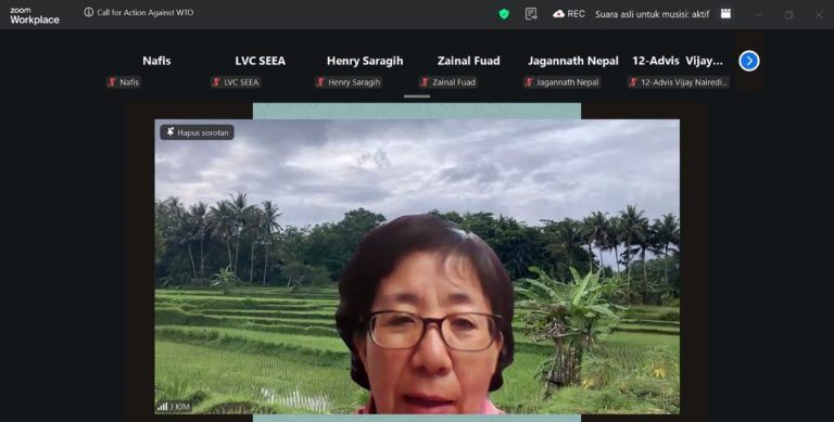Shalmali Guttal menyampaikan bahwa WTO telah gagal memenuhi janji sebagai forum multilateral yang adil. “WTO adalah jebakan bagi negara berkembang. Tidak ada solusi nyata untuk kemiskinan, kelaparan, atau krisis global,” katanya. Ia menegaskan bahwa sistem perdagangan global seharusnya mengacu pada Deklarasi PBB tentang Hak Asasi Petani dan Orang yang Bekerja di Pedesaan (UNDROP), khususnya Pasal 28 yang menegaskan bahwa seluruh kerangka kebijakan harus selaras dengan pemenuhan hak asasi manusia. “Di sisi lain, pemerintah juga wajib mengacu pada Pasal 2 UNDROP untuk melindungi hak-hak petani dari sistem pangan yang tidak adil, termasuk memastikan adanya konsultasi yang bermakna sebelum mengambil kebijakan,” tegasnya.